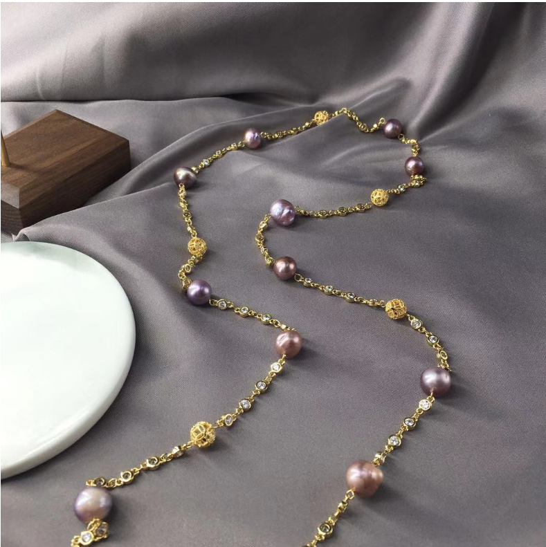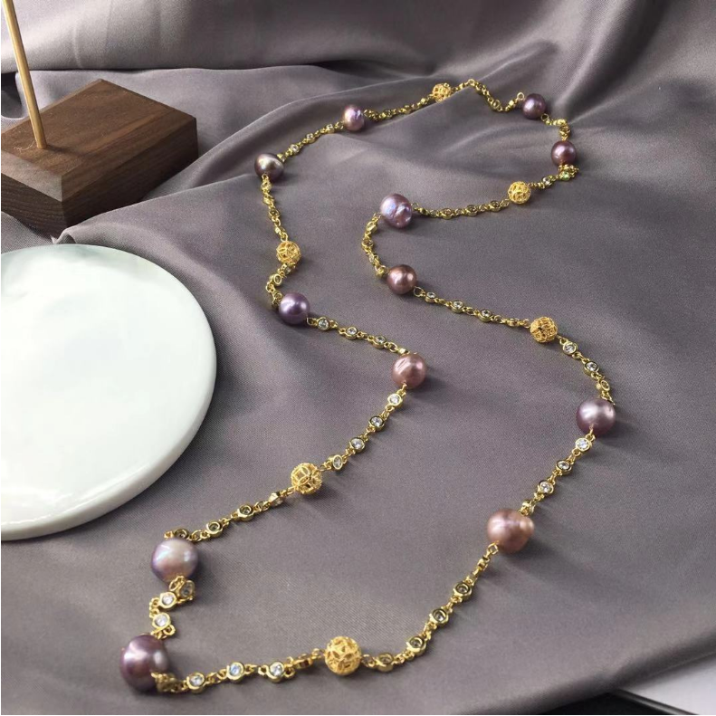 14K gold filled long chain Luxury baroque fresh water pearl beads 9-10MM necklace jewelry