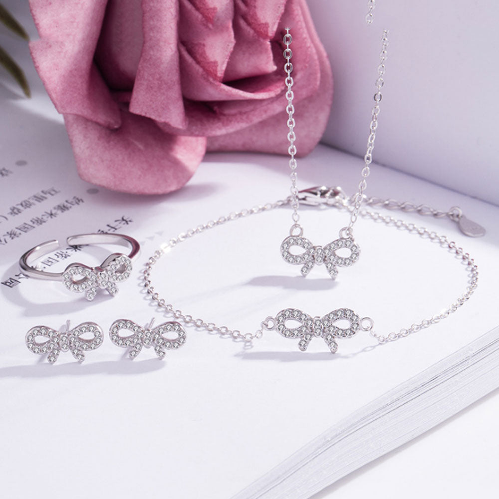 korean style mini 925 sterling silver butterfly bowknot charm necklace bracelet earring and ring jewelry set