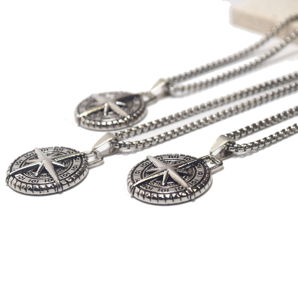 ancient silver stainless steel chain men brass alloy compass medal coin pendant necklace jewelry