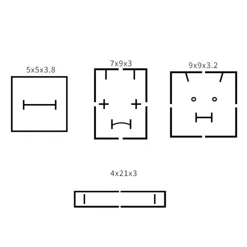 5x5x3.8cm, 7x9x3cm, 9x9x3.2cm, 4x21x3cm,