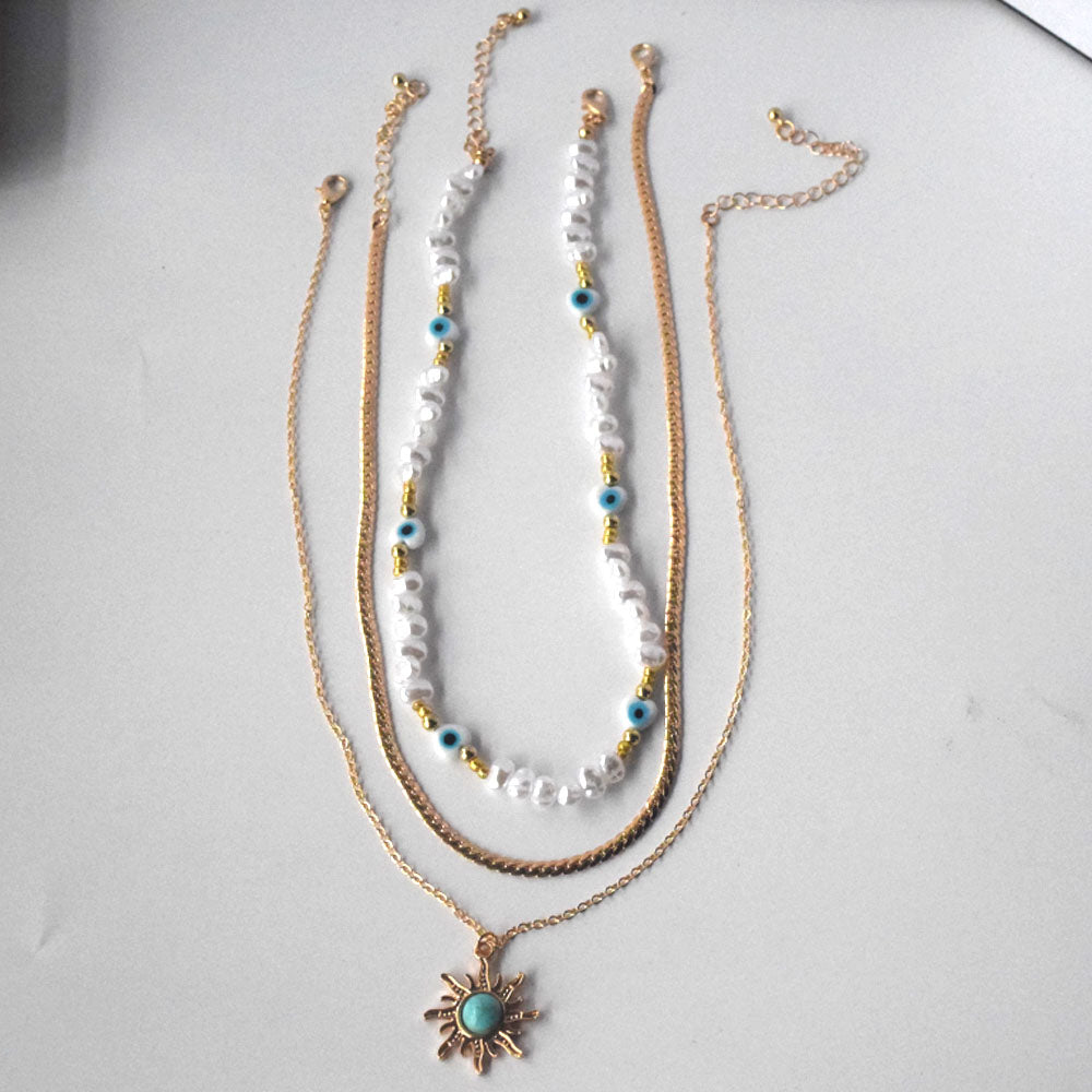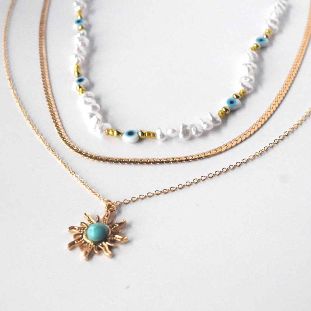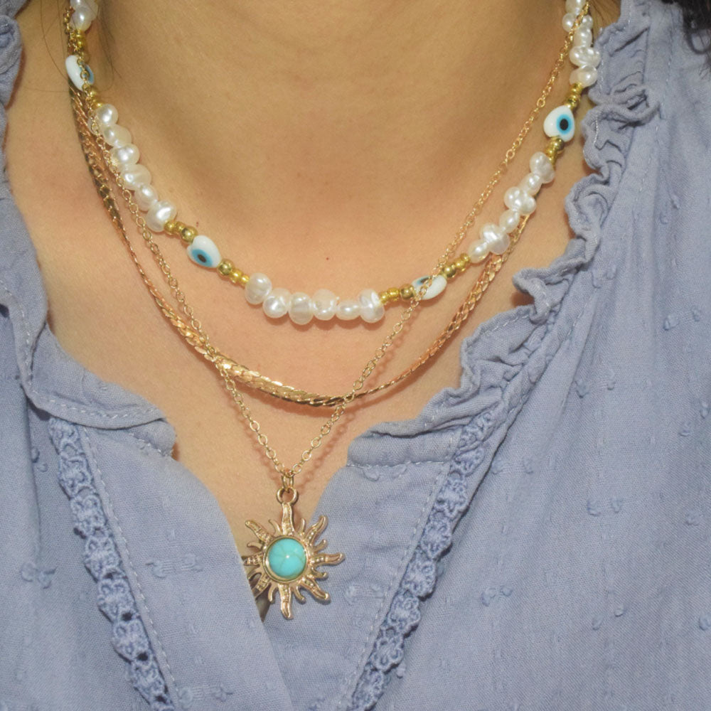 dainty brass alloy multi layer gold plated necklace turquoise stone sun pendant snake chain evil eyes bead necklaces 3 layered