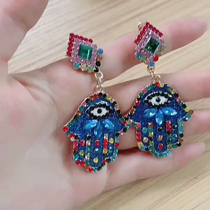 fashion fancy dazzling women shinning rhinestone beads hand made earrings jewelry women hamsa hand d-evil eye earring