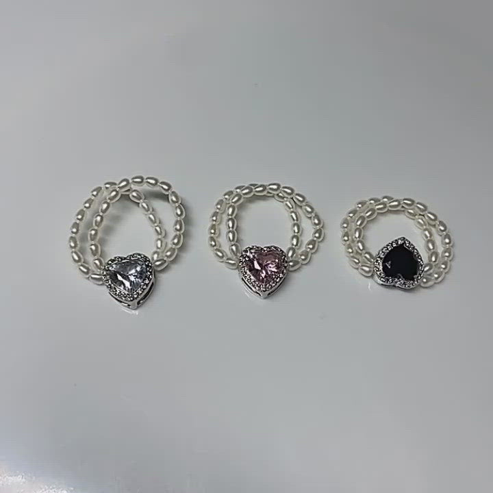 handmade elastic artificial pearl beads beaded resizable black heart charm dome finger ring jewelry rings