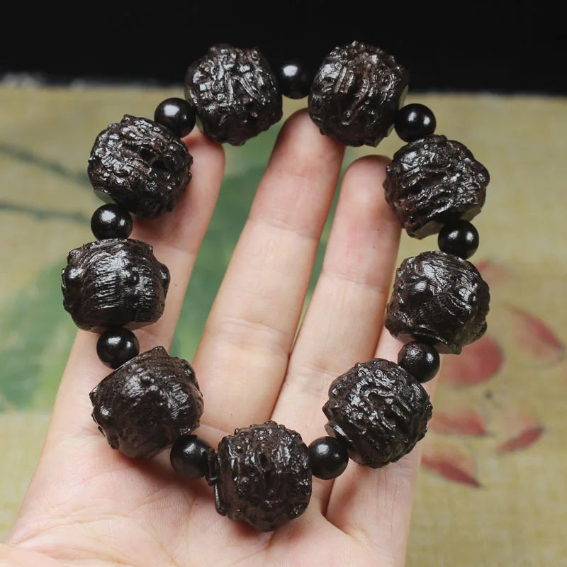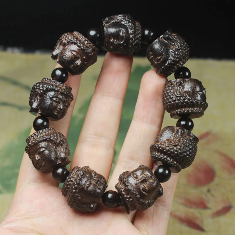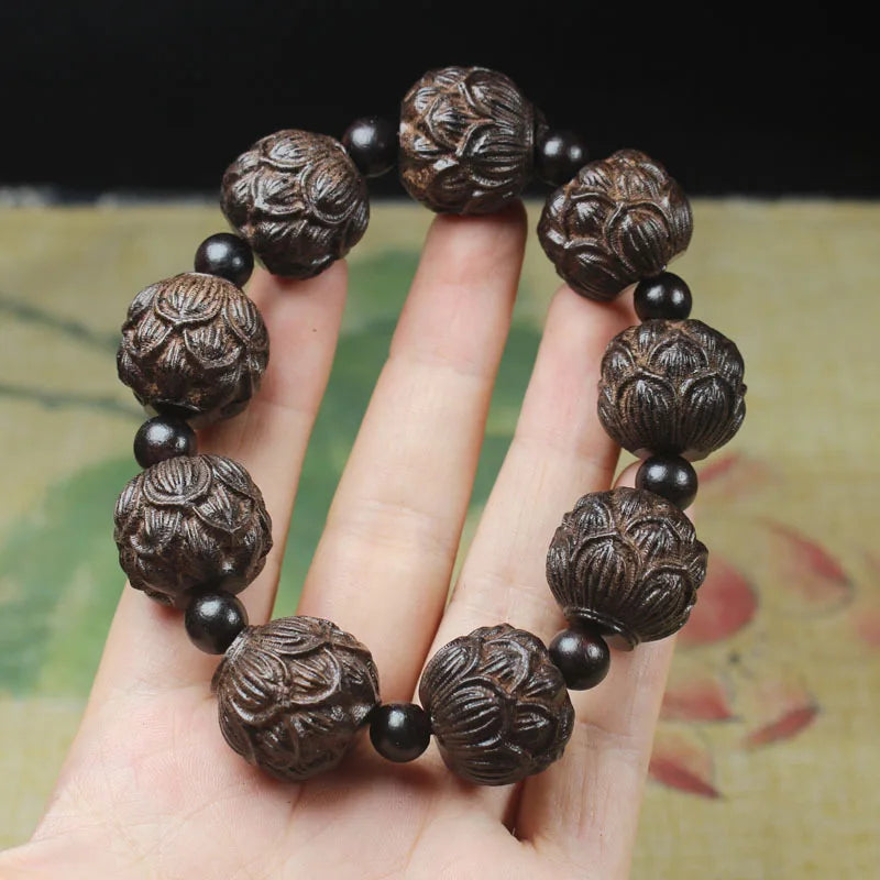 handmade wood engraving stretch good luck buddha Avalokitesvara lotus bracelet men jewelry
