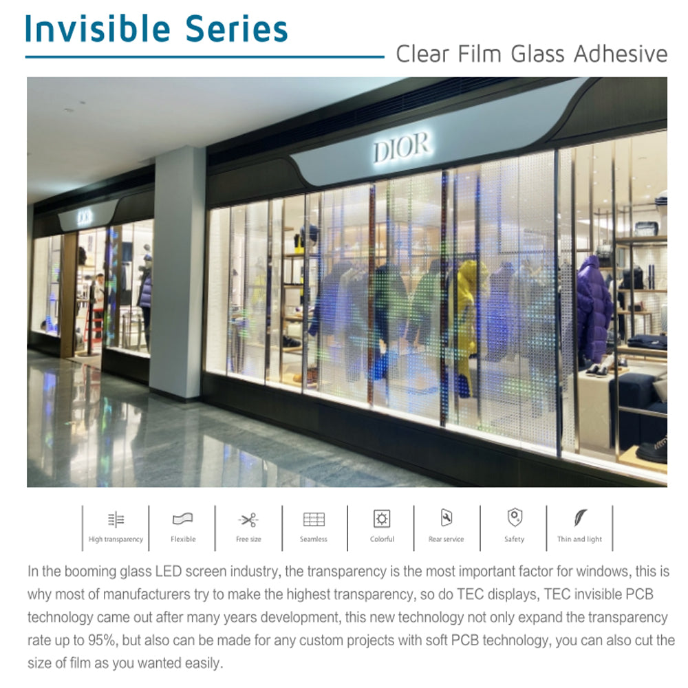 indoor outdoor Flexible Clear film adhesive transparent micro led screen animation for glass wall door window advertising p8