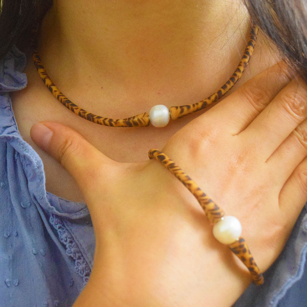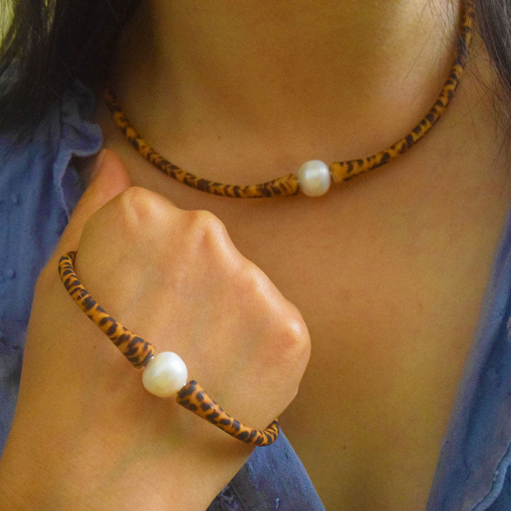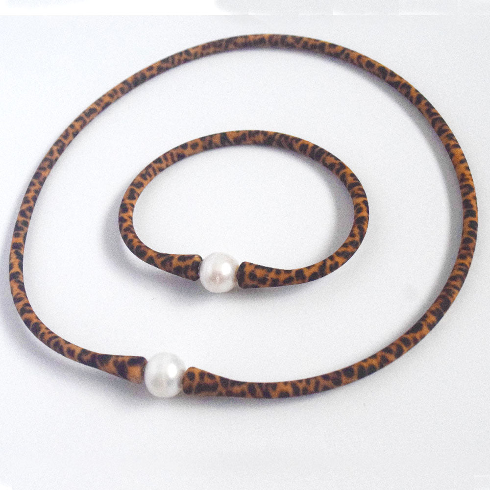 sea travel silicone rubber bracelet necklace jewelry set waterproof with genuine pearl charm bead leopard print