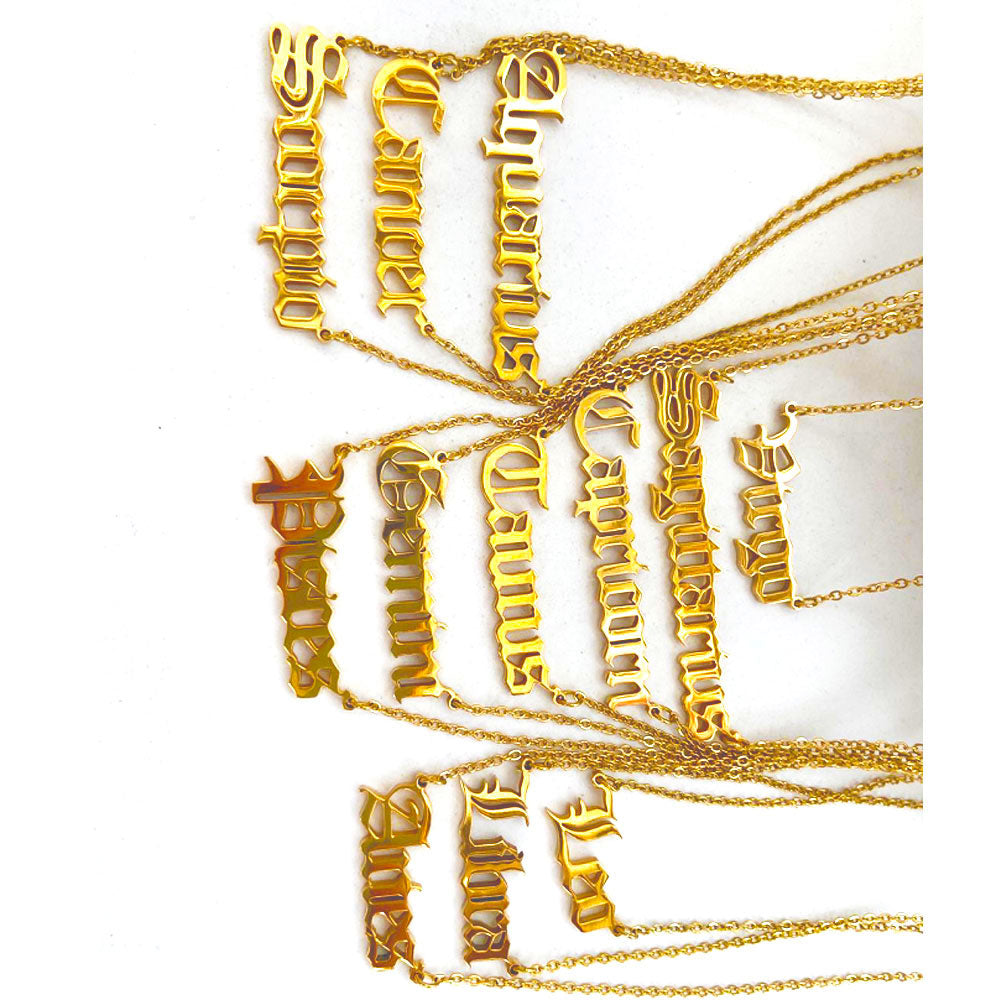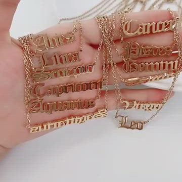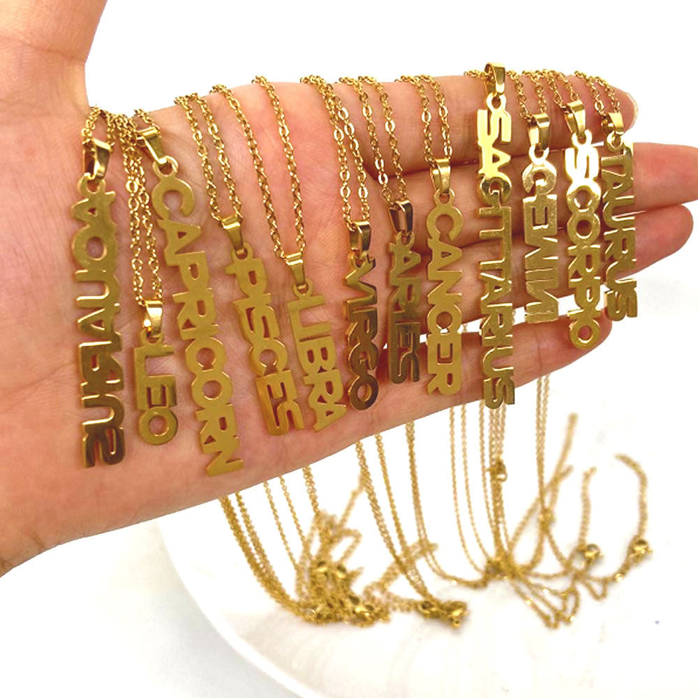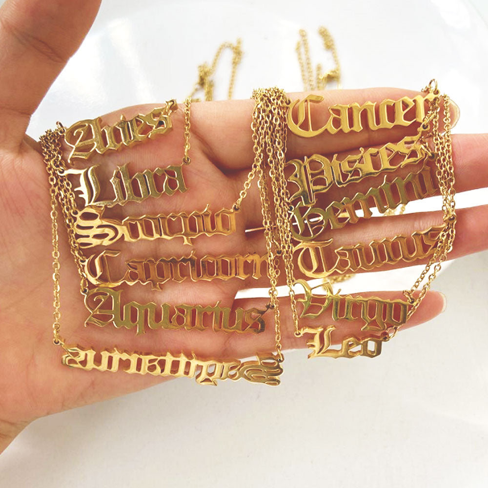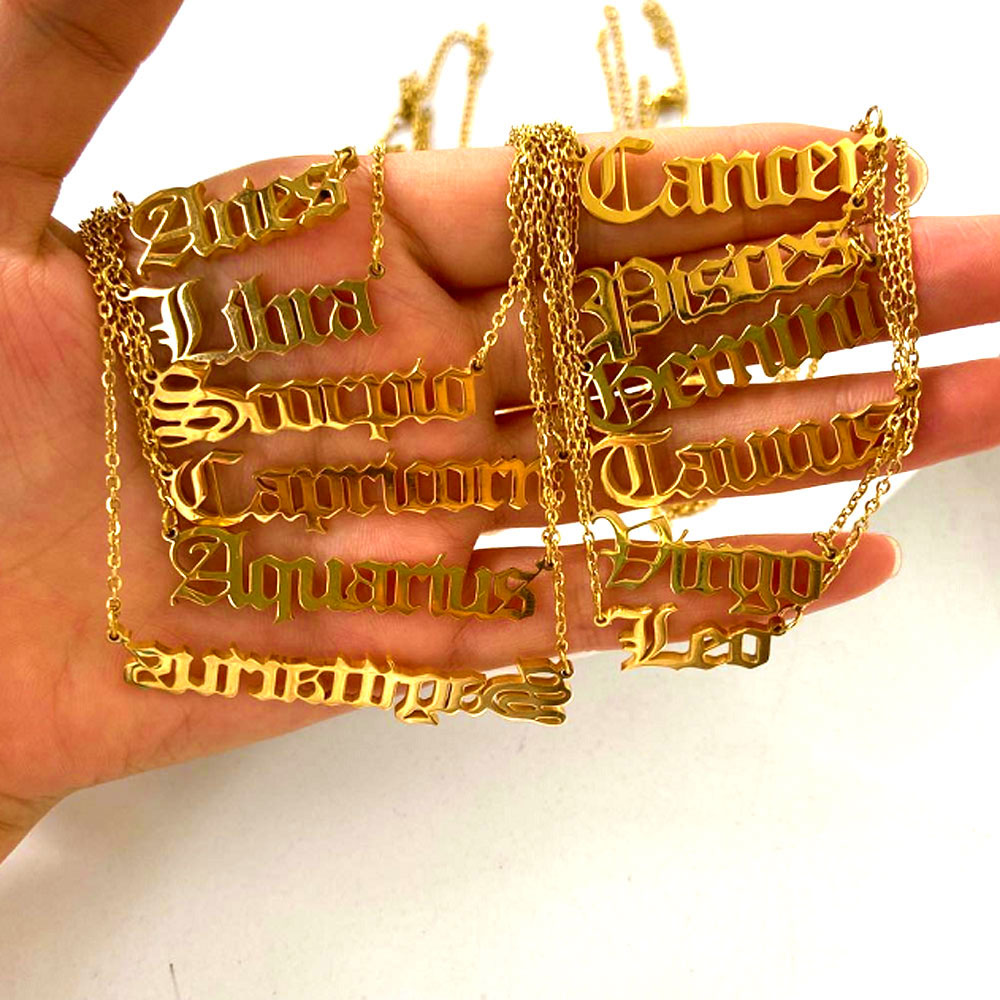 stainless steel old english font gold silver plated horoscope tewelve zodiac sign pendant chain necklace jewelry for women