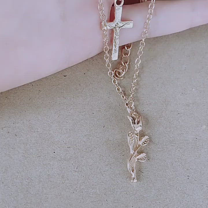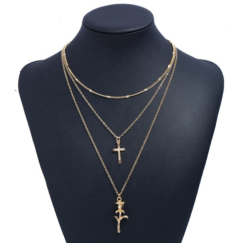 Trendy babygirl women necklace cross and rose pendant gold plated layered necklace