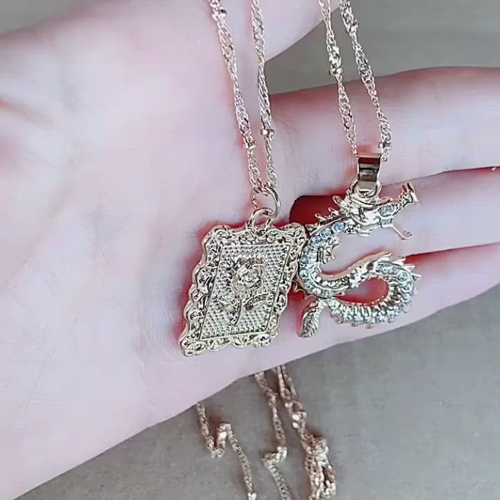 Vintage Jewelry Necklace Animal Crystal Rhinestone Rose Coin Pendant Multi layered Zodiac Gold Dragon Necklace