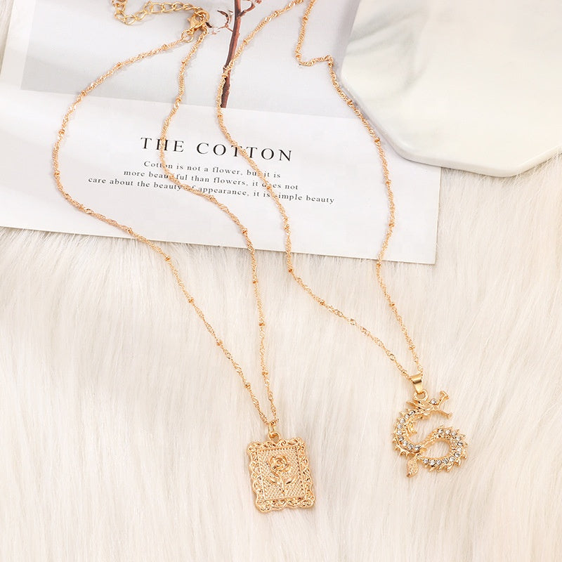 Vintage Alloy Jewelry Necklace Animal Crystal Rhinestone Rose Coin Pendant Multi layered Zodiac Gold Dragon Necklace
