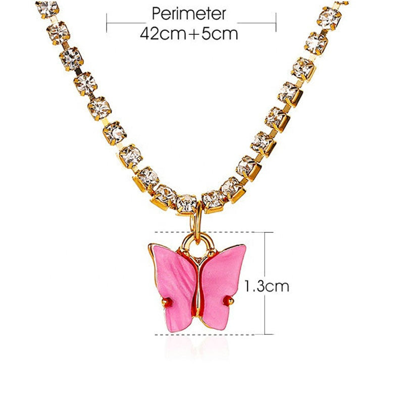 White Purple Blue Pink Butterfly Crystal Rhinestone Engraved Tennis Chain Charm Necklace Butterfly